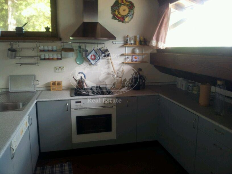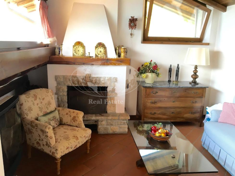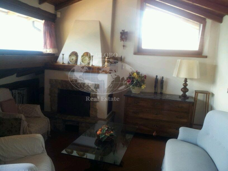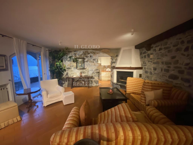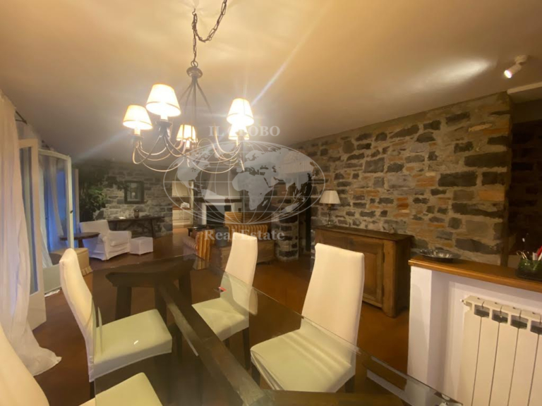 The second apartment, accessible from the north, features an inviting living room and an open-space kitchen, along with a service bathroom. The upper level includes three bedrooms and two additional bathrooms, ensuring ample space for guests or family members.